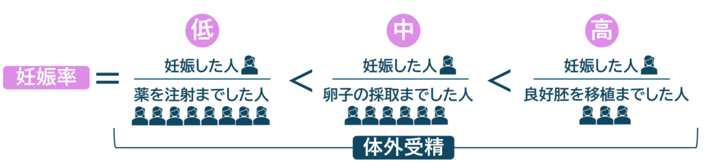 【妊娠率=妊娠した人/体外受精を受けた人】です。つまり、妊娠率は体外受精を受けた人のうち妊娠した人の割合です。