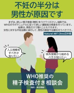 まずは、詳しい精子検査(無料)を受けてください。当院では、WHOのラボマニュアルに従って詳しい運動能力検査を行っています。